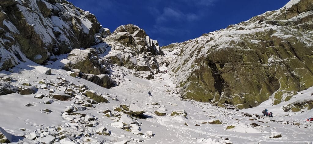 Para llegar al pie de la Canal, rodeamos por completo la laguna, y nos colocamos bajo la pared de la montaña. Dos canales se abren frente a nosotros, la más ancha y recta es el corredor Central, y el estrecho que sube casi en paralelo es el Corredor de la Ceja, la canal por la que vamos a subir.
