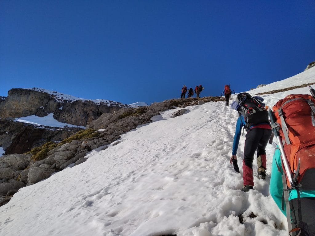 Bien, si es verano o no hay nieve podemos elegir entre subir por el paso de las mulas o las clavijas, pero si el terreno está nevado, hay que hacerlos por las clavijas pues el riego de desprendimiento de nieve en el Paso de las Mulas es elevado.